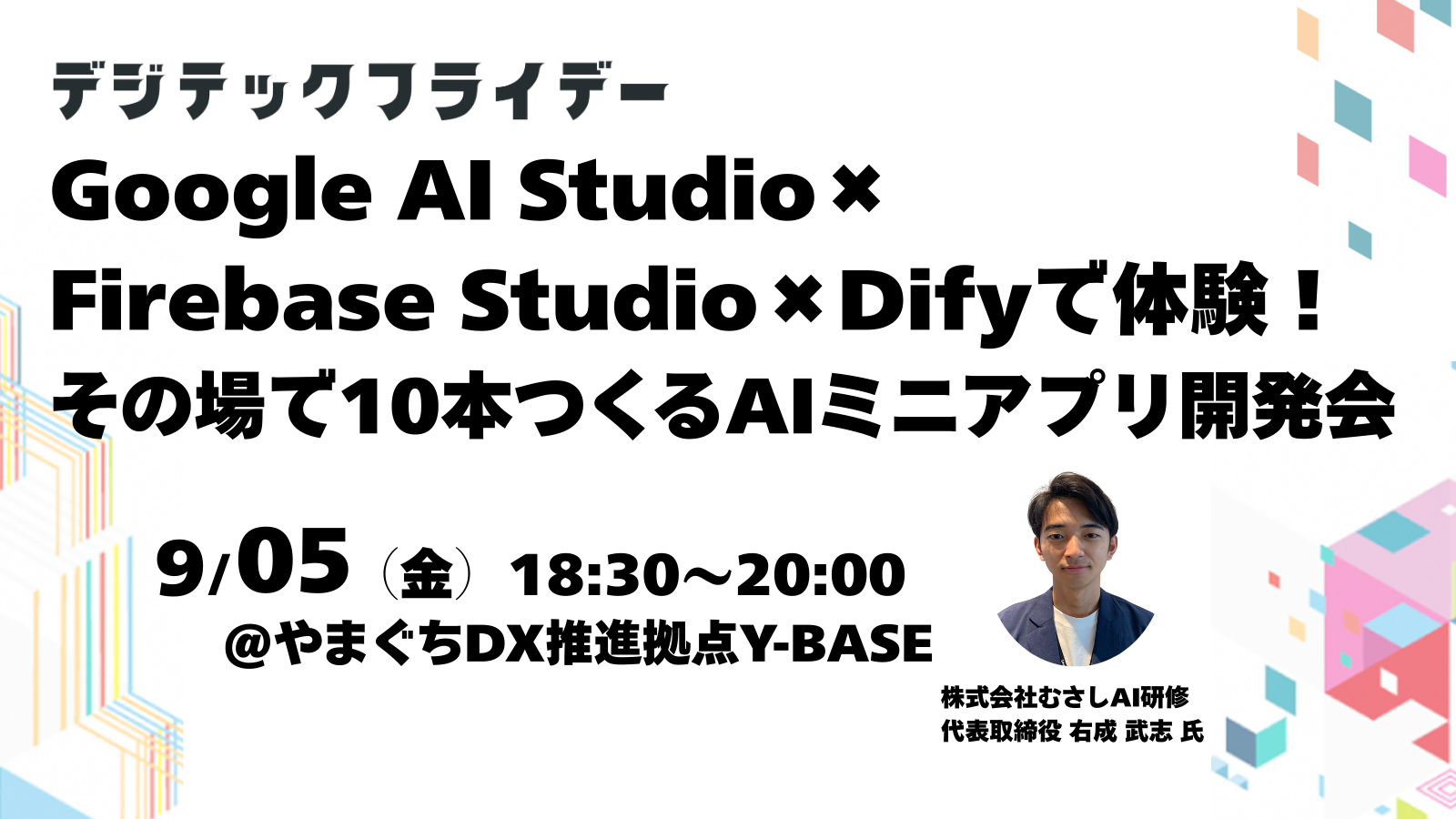 第26回の9月5日(金)は、株式会社むさしAI研修 代表取締役 右成さんと、Google AI Studio(Gemini)・Firebase Studio・Difyを使い、その場で動くAIミニアプリを最大10本作る実践ワークショップを開催します。