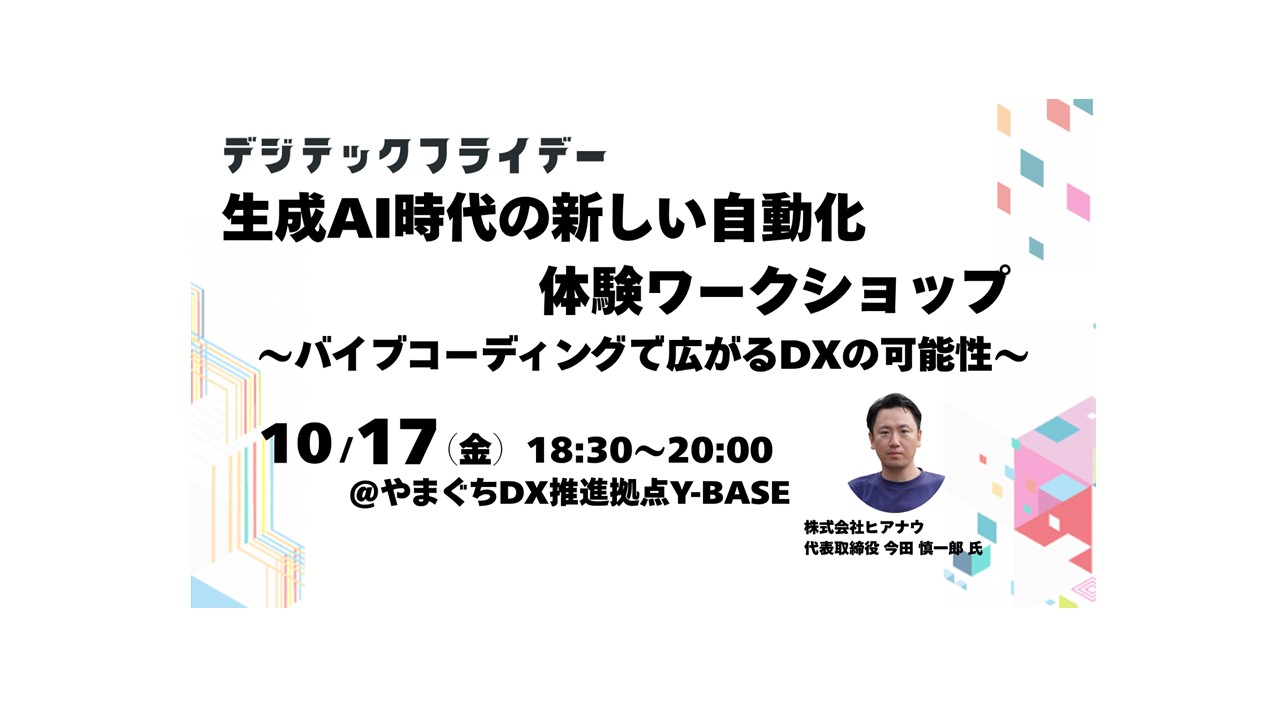 募集中デジテック for YAMAGUCHI【2025.10.17開催】生成AI時代の新しい自動化体験ワークショップ ~バイブコーディングで広がるDXの可能性~