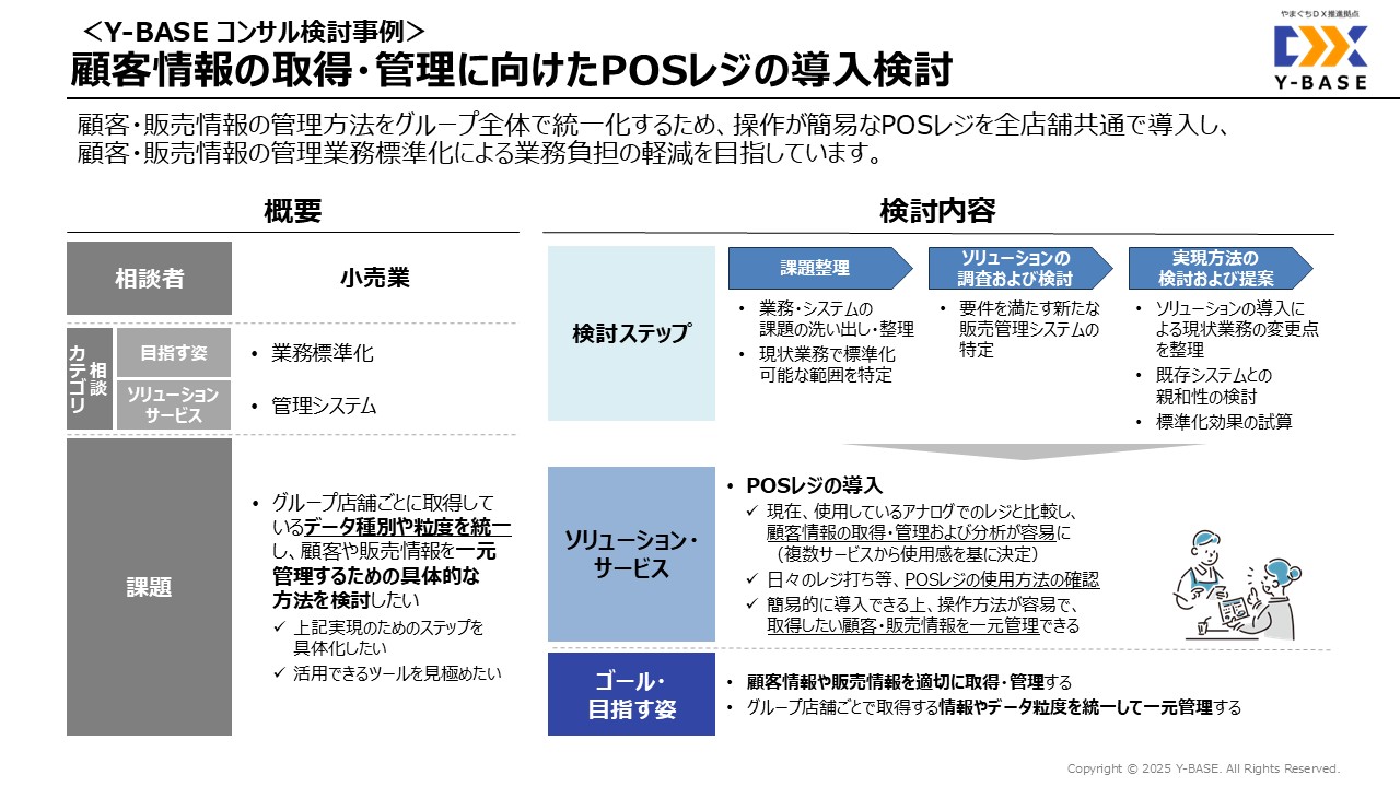 ゴール・目指す姿 | ・顧客情報や販売情報を適切に取得・管理する ・グループ店舗ごとで取得する情報やデータ粒度を統一して一元管理する |