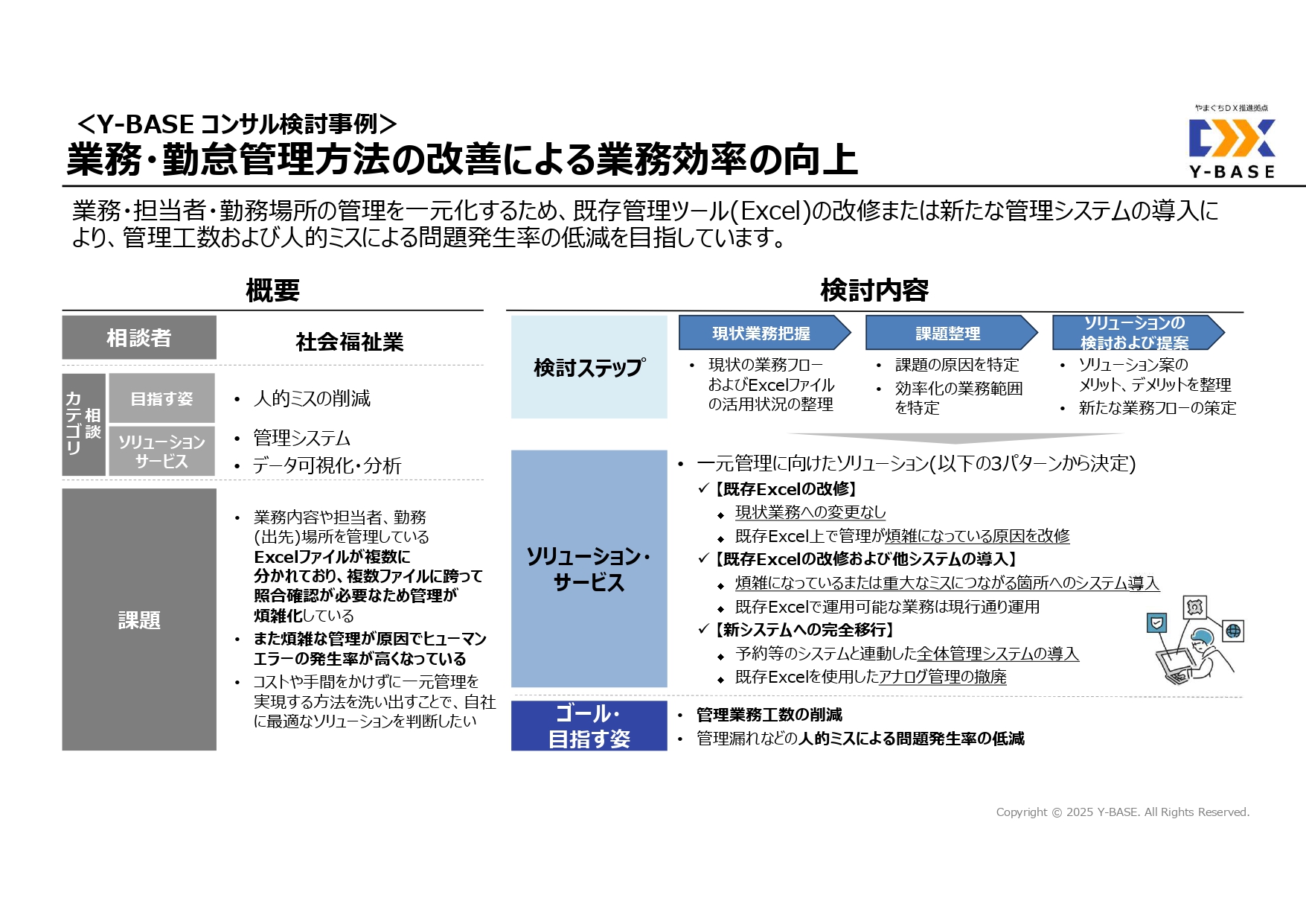 業務・担当者・勤務場所の管理を一元化するため、既存管理ツール(Excel)の改修または新たな管理システムの導入により、管理工数および人的ミスによる問題発生率の低減を目指しています。