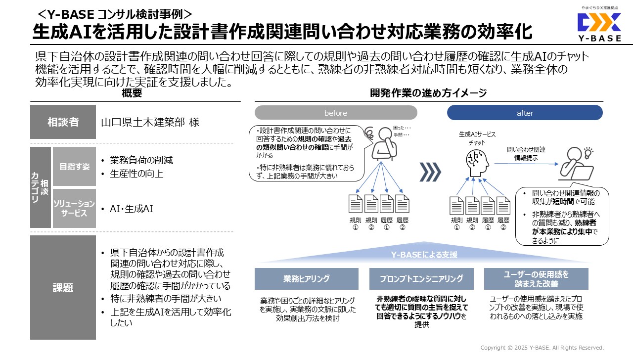 県下自治体の設計書作成関連の問い合わせ回答に際しての規則や過去の問い合わせ履歴の確認に生成AIのチャット機能を活用することで、確認時間を大幅に削減するとともに、熟練者の非熟練者対応時間も短くなり、業務全体の効率化実現に向けた実証を支援しました。