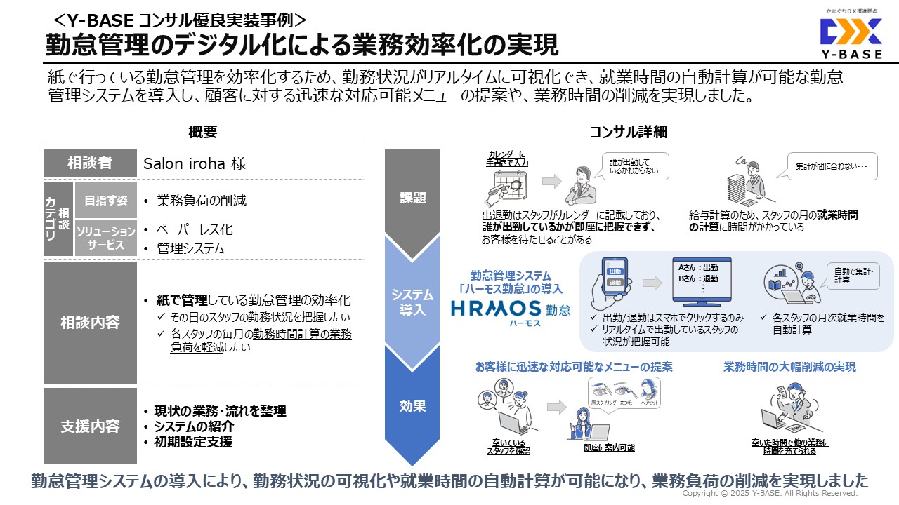 | 相談内容 | ・紙で管理している勤怠管理の効率化 ✓その日のスタッフの勤務状況を把握したい ✓各スタッフの毎月の勤務時間計算の業務負荷を軽減したい |