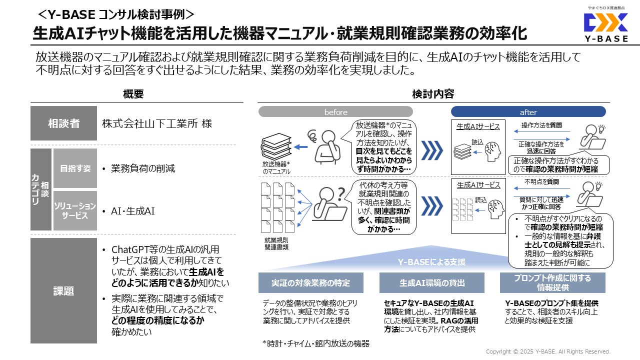 | Y-BASEによる支援 | ・実証の対象業務の特定 ✓データの整備状況や業務のヒアリングを行い、実証で対象とする業務に関してアドバイスを提供 ・生成AI環境の貸出 ✓セキュアなY-BASEの生成AI環境を貸し出し、社内情報を基にした検証を実現 ✓RAGの活用方法についてもアドバイスを提供 ・プロンプト作成に関する情報提供 ✓Y-BASEのプロンプト集を提供することで、相談者のスキル向上と効果的な検証を支援 |