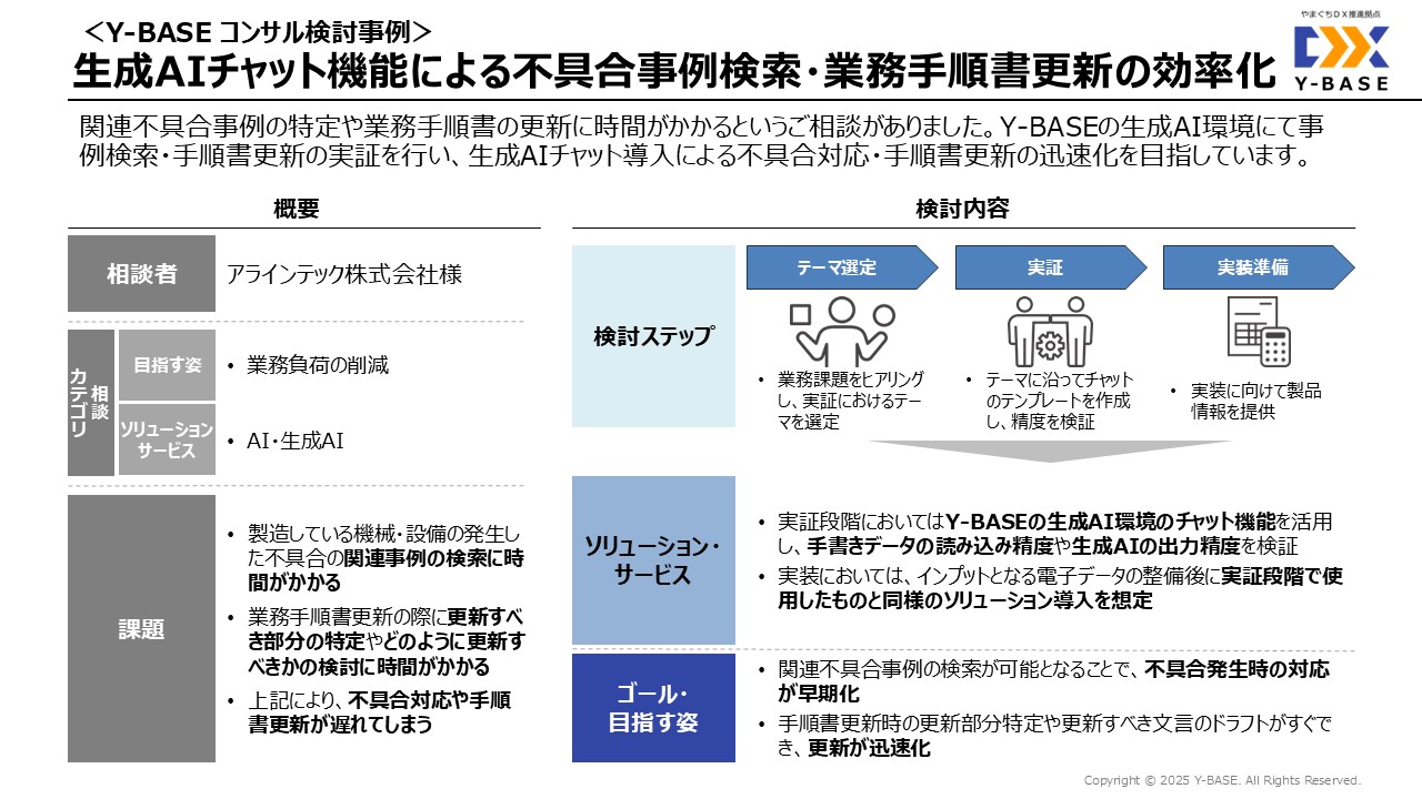 関連不具合事例の特定や業務手順書の更新に時間がかかるというご相談がありました。Y-BASEの生成AI環境にて事例検索・手順書更新の実証を行い、生成AIチャット導入による不具合対応・手順書更新の迅速化を目指しています。