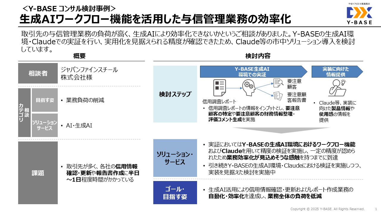 | ソリューション・サービス | ・実証においてはY-BASEの生成AI環境におけるワークフロー機能およびClaudeを用いて精度の検証を実施し、 一定の精度が認められたため業務効率化が見込めそうな感触を持つまでに到達 ・引き続きY-BASEの生成AI環境・Claudeにおける検証を実施しつつ、実装を見据えた検討を実施中 |