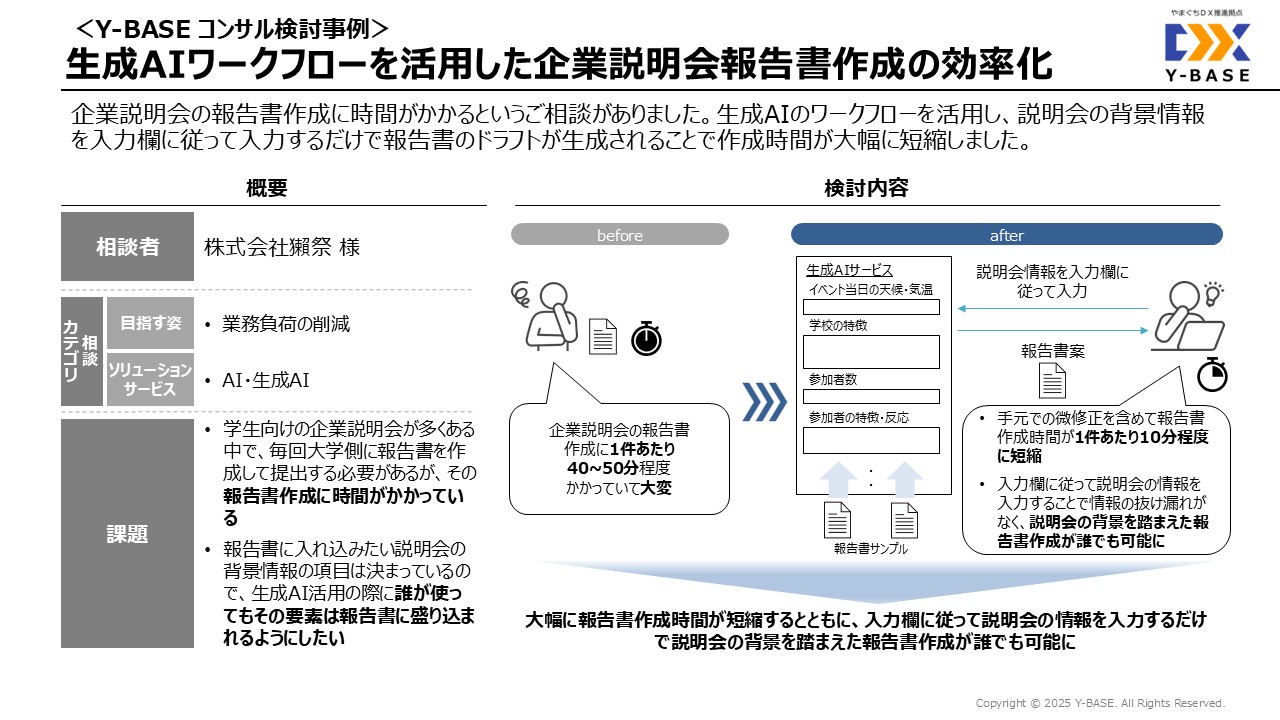 企業説明会の報告書作成に時間がかかるというご相談がありました。生成AIのワークフローを活用し、説明会の背景情報を入力欄に従って入力するだけで報告書のドラフトが生成されることで作成時間が大幅に短縮しました。