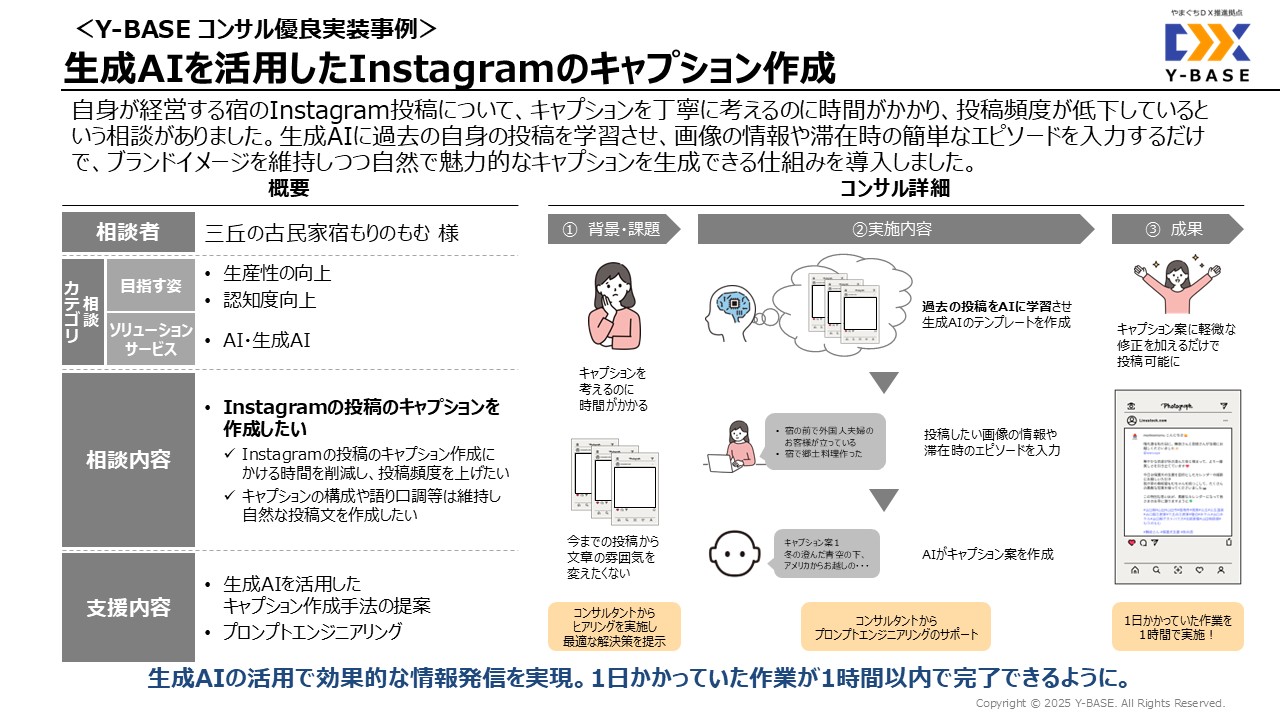 自身が経営する宿のInstagram投稿について、キャプションを丁寧に考えるのに時間がかかり、投稿頻度が低下しているという相談がありました。生成AIに過去の自身の投稿を学習させ、画像の情報や滞在時の簡単なエピソードを入力するだけで、ブランドイメージを維持しつつ自然で魅力的なキャプションを生成できる仕組みを導入しました。