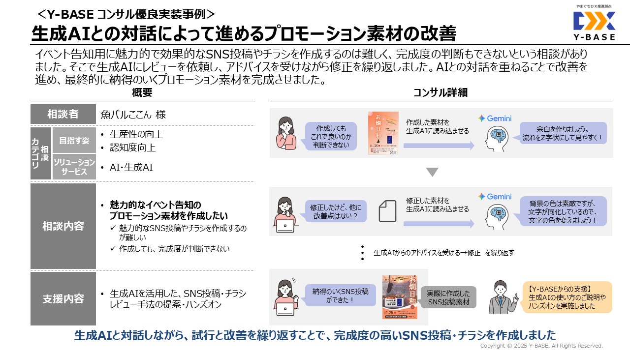 イベント告知用に魅力的で効果的なSNS投稿やチラシを作成するのは難しく、完成度の判断もできないという相談がありました。そこで生成AIにレビューを依頼し、アドバイスを受けながら修正を繰り返しました。AIとの対話を重ねることで改善を進め、最終的に納得のいくプロモーション素材を完成させました。