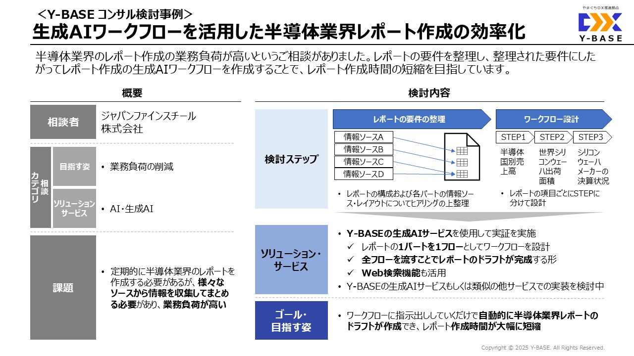 半導体業界のレポート作成の業務負荷が高いというご相談がありました。レポートの要件を整理し、整理された要件にしたがってレポート作成の生成AIワークフローを作成することで、レポート作成時間の短縮を目指しています。