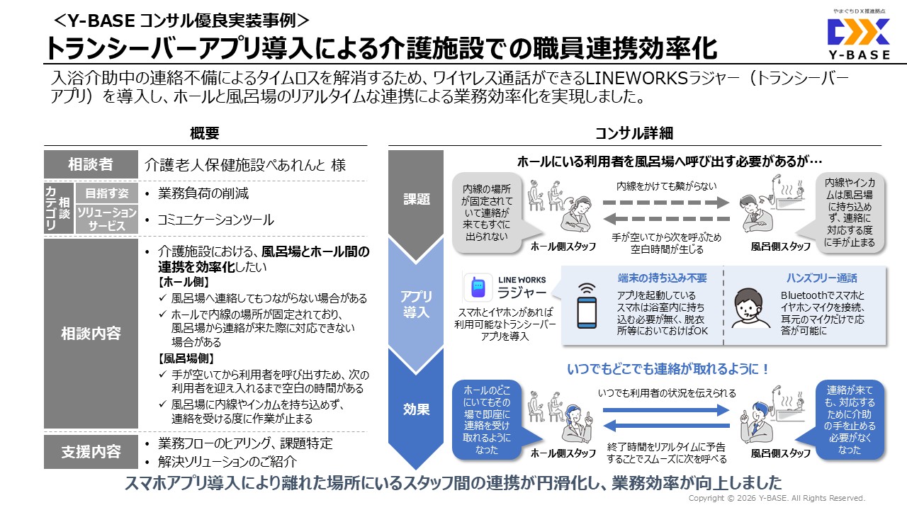 | 相談内容 | ・介護施設における、風呂場とホール間の連携を効率化したい 【ホール側】 ✓風呂場へ連絡してもつながらない場合がある ✓ホールで内線の場所が固定されており、風呂場から連絡が来た際に対応できない場合がある 【風呂場側】 ✓手が空いてから利用者を呼び出すため、次の利用者を迎え入れるまで空白の時間がある ✓風呂場に内線やインカムを持ち込めず、連絡を受ける度に作業が止まる |