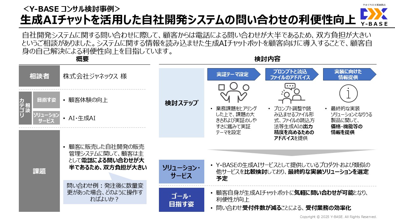 | ソリューション・サービス | ・Y-BASEの生成AIサービスとして提供しているプロダクトおよび類似の他サービスを比較検討しており、 最終的な実装ソリューションを選定予定 |