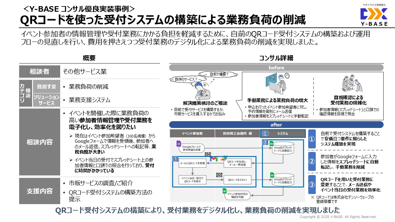 | 支援内容 | ・市販サービスの調査/ご紹介 ・QRコード受付システムの構築方法の提示 |