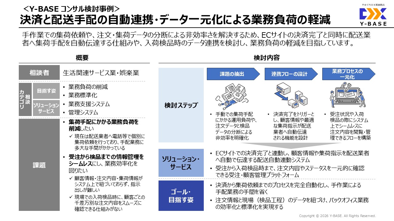 手作業での集荷依頼や、注文・集荷データの分断による非効率さを解決するため、ECサイトの決済完了と同時に配送業者へ集荷手配を自動伝達する仕組みや、入荷検品時のデータ連携を検討し、業務負荷の軽減を目指しています。