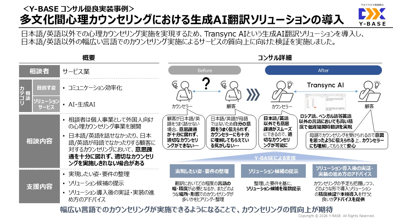 日本語/英語以外での心理カウンセリング実施を実現するため、Transync AIという生成AI翻訳ソリューションを導入し、日本語/英語以外の幅広い言語でのカウンセリング実施によるサービスの質向上に向けた検証を実施しました。